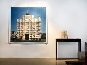 De g. à d. Deidi von Schaewen et Michel et Andrée Hirlet, devant le 19 Paul Fort.« L’exposition « Équilibres construits » réunit les sculpteurs céramistes Andrée et Michel Hirlet et la photographe Deidi von Schaewen. Les sculptures des Hirlet et les photographies de Deidi von Schaewen relèvent d’un même regard porté sur la relation entre les espaces et les hommes. Ils semblent partager dans leurs domaines respectifs les notions de double peau, de lignes rigoureuses, d’élévations, d’encastrement et d’imbrication, ainsi qu’un même attrait pour les plages de couleurs juxtaposées. Aux portraits d’immeubles ravalés ou en construction réalisés par la photographe répondent les imbrications de terre émaillé souvent colorée des Hirlet, dont les titres des sculptures sont révélateurs de ces multiples correspondances : « Complètement imbriqués ».